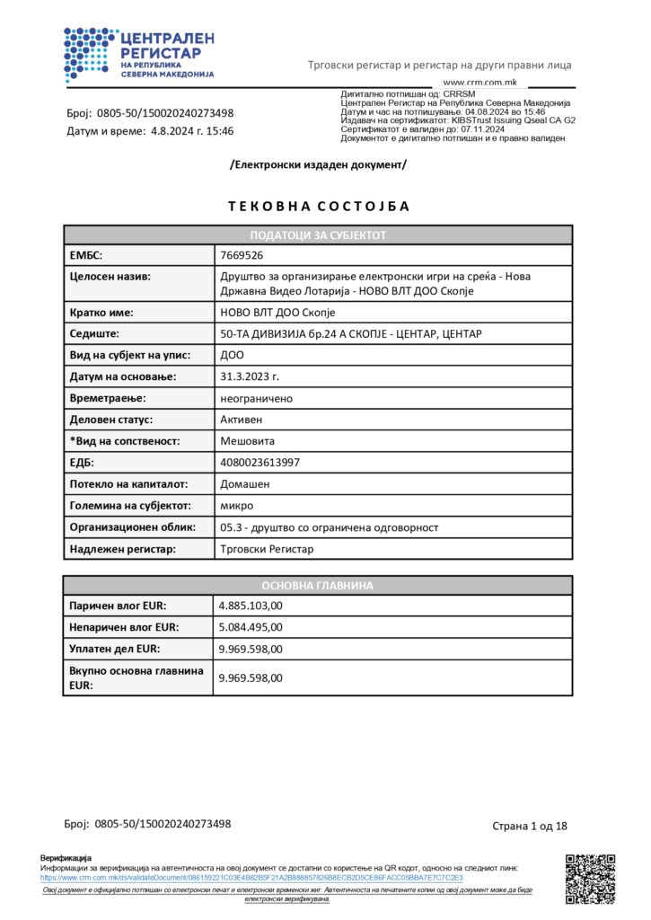 Според Сали, кој покажа и тековни состојби на фирмите, АД Државна Лотарија на 31 март 2023 година преку делегирање на 51% во сопственичкиот капитал, регистрирал втора видео лотарија под името Ново ВЛТ со основна главнина од безмалку 10 милиони евра.