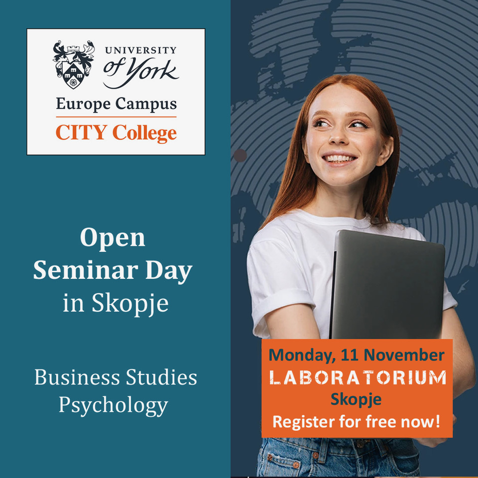 Се покануваат сите ученици и студенти заинтересирани за бесплатно учество на Отворениот ден и кои сакаат дополнително да се информираат за академските програми и за можностите за студирање на Европскиот кампус на Универзитетот Јорк да се пријават.