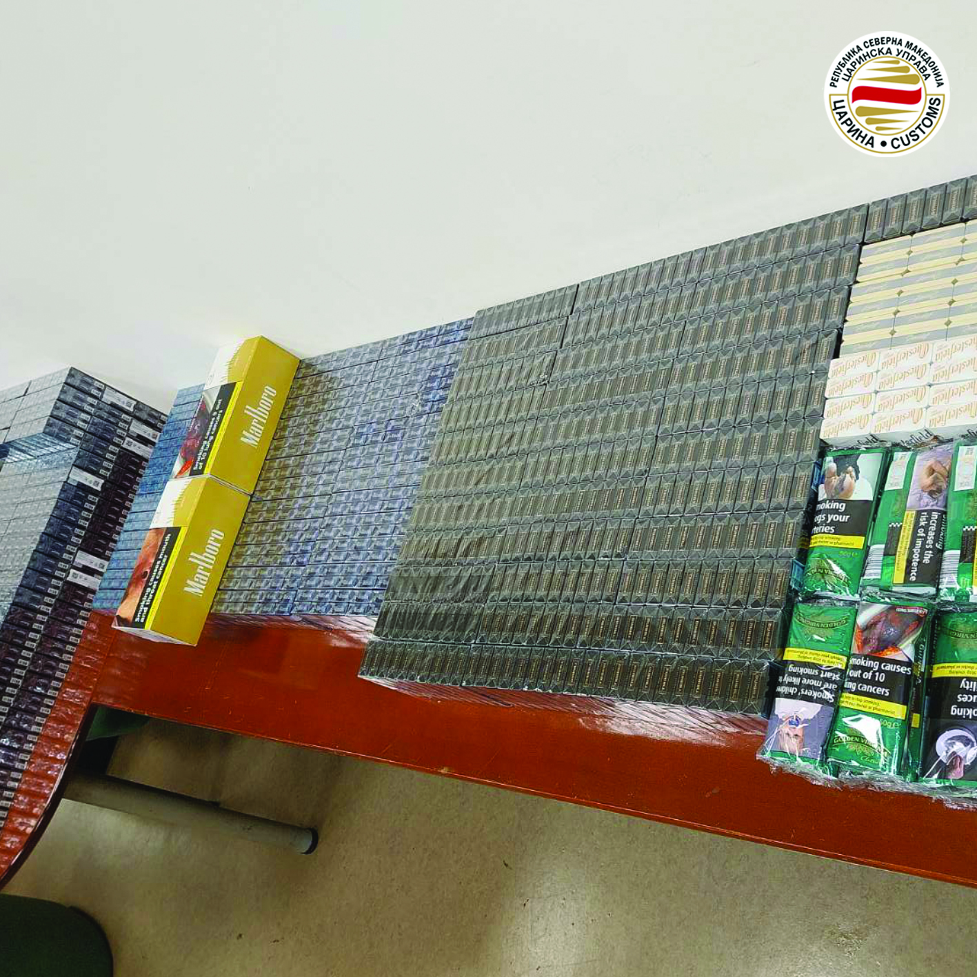 „231 штеки цигари со македонски акцизни маркички и 1,5 килограми тутун без акцизни маркички, со вкупна вредност од 367.130 денари се откриени на Меѓународниот аеродром Скопје, при контрола на патните торби на двајца македонски државјани кои имале намера да отпатуваат со лет за Лондон. Царинските службеници од царинската испостава Аеродром Скопје и припадници на Граничната меѓуагенциска единица селектираа патници поради контрола на нивниот багаж, при што по извршената контрола со помош на скенер, во патните торби на еден патник биле пронајдени 203 штеки цигари и 1.500 грама тутун, а во патната торба на друг патник биле пронајдени 28 штеки цигари. Царински службеници на влез во државата на граничен премин Богородица спречија шверц на 33 штеки цигари коишто биле скриени во фабрички прегради на два камиони. Мобилен тим во соработка со полициски службеници заплени 59 штеки цигари со вкупна вредност од 244 илјади денари откриени при контрола на автомобил во Битола“, информираа од Царинската управа.