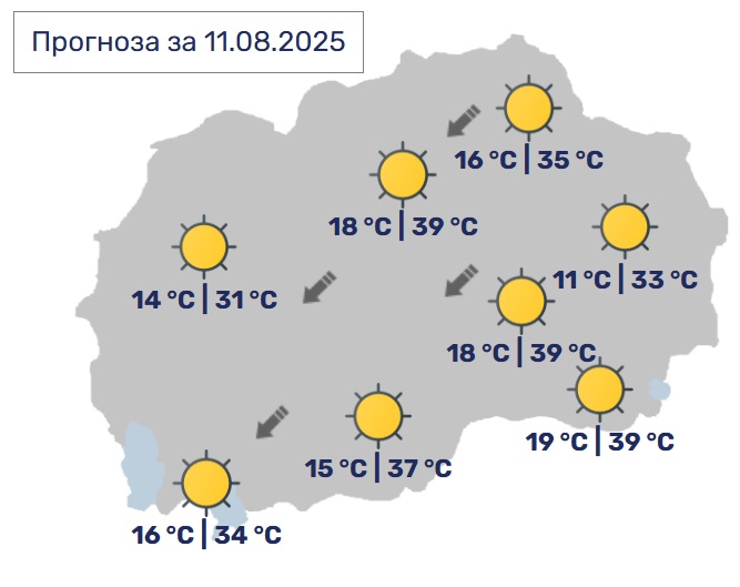Минималната температура ќе биде во интервал од 11 до 19, а максималната ќе достигне од 31 до 39 Целзиусови степени.