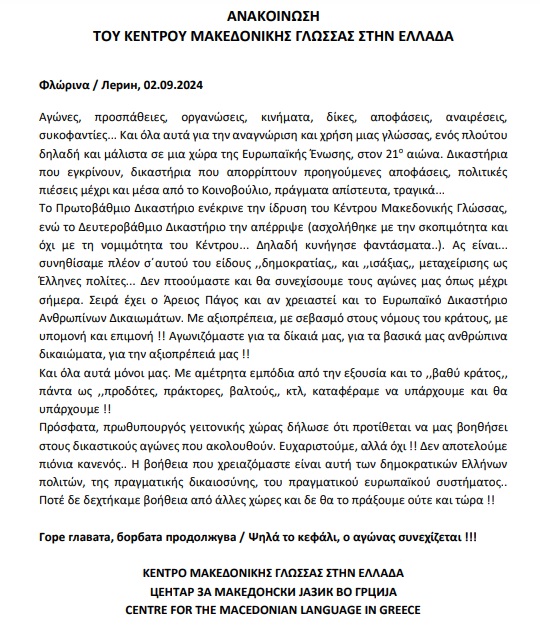 Најпрво Основниот суд во Лерин ја дозволи регистрацијата на Центарот за македонски јазик, но Апелацискиот суд не го доволи тоа и „се занимаваше со целесообразност, а не со легитимитетот на Центарот… односно бркаше духови“, се вели во реакцијата.
