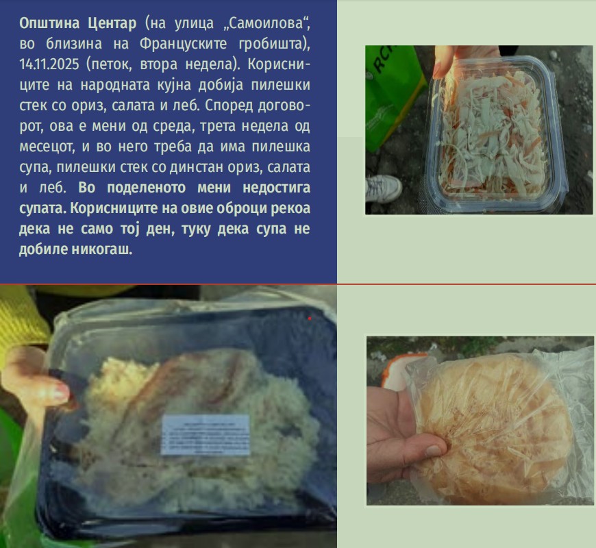 „Договорот за јавна набавка на готови оброци за корисниците на народни кујни во вредност од 1,5 милион евра не се спроведува во согласност со условите утврдени во тендерската документација и понудата, што е спротивно на Законот за јавни набавки. Тендерската документација на Министерство за социјална политика, демографија и млади упатува на постоење простории кои служат како народни кујни, но во пракса, на седум од девет наведени локации, храната се дели директно на улица, а комбињата се задржуваат од 15 до 30 минути“, констатирале од Центарот за граѓански комуникации (ЦГК).
