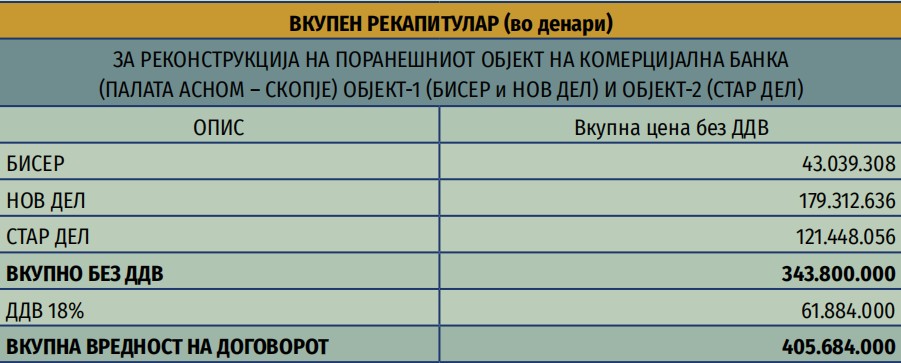 „Вредноста на овој договор без пресметан данок на додадена вредност (ДДВ) изнесува 343.800.000 денари. ДДВ изнесува 61.884.000 денари. Вкупната вредност на овој договор со пресметан данок на додадена вредност изнесува 405.684.000 денари. Во овој случај, проблематично е и тоа што рокот за изградба на државниот објект од 18 месеци од ‘воведување во работа’ бил услов утврден во тендерската документација. СОЗР двапати се согласила на продолжувањето на рокот за градба, првиот до декември 2025 година и вториот пат до јуни 2026 година. Менувањето на рокот кој бил услов во тендерската документација претставува повреда на начелото на еднаков третман на економските оператори бидејќи подолгиот рок на реконструкција можел да влијае врз понудените цени, како и врз можноста на други фирми да учествуваат“, појаснуваат од ЦГК.