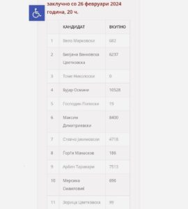 Според последниот пресек на собрани потписи заклучно со синоќа во 20 часот, Томе Николоски се уште не добил ниту еден потпис на поддршка, за Господин Попоски засега 19 вевчанци дадода гаранција пред Општинската изборна комисија дека му ја даваат поддршката, Зорица Цветсковска собра 99 потписи, а Ѓорги Манасков има 186 потписи. Како што може да се види од табелата, работата ја завршил единствено Бујар Османи како кандидат на ДУИ кој веќе ја преминал бројката од 10.000 потписи, додека блиску до потребната граѓанска поддршка се Максим Димитриевски канидат на ЗНАМ-За наша Македонија, Арбен Таравари на коалицијата Вреди, а блиску до Таравари е и кандидатката на Левица, Билјана Ванковска.