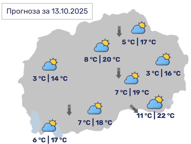 До вторник ќе се задржи стабилно време со дневни температури малку под просекот за овој период од годината, а веќе од среда под влијание на влажни воздушни маси, се очекуваат повторно локални врнежи од дожд. Дневната температура ќе опадне за неколку степени.