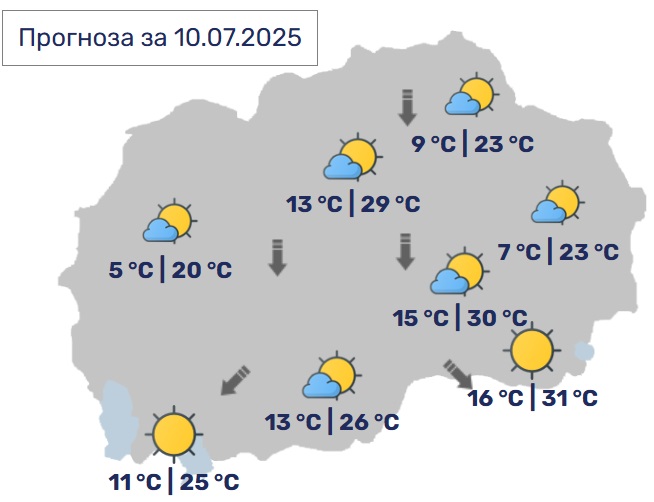 Во Скопје, сончево со мала до умерена облачност. Ќе дува засилен ветер од северен правец. Минималната температура ќе се спушти до 13, а максималната ќе достигне до 29 степени.