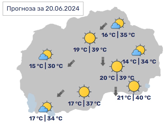 Во Скопје сончево и многу топло со слаб до умерен ветер од северен правец. Минималната температура ќе се спушти до 19, а максималната ќе достигне до 39 степени.