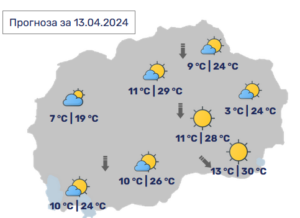 Во Скопје ќе биде сончево и топло со мала облачност. Ќе дува слаб до умерен ветер од северен правец. Минималната температура ќе се спушти до 11, а максималната ќе достигне 29 степени.