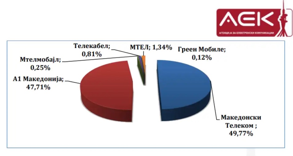 Заклучно со првиот квартал од годинава во државава се регистрирани 1.941.996 активни претплатници во мобилната телефонија, во кои удел од 47,69 проценти има А1 Македонија, 46,66 проценти Македонски телеком, 3,38 проценти на М-ТЕЛ, виртуелниот мобилен оператор што влезе на пазарот во октомври 2022 година, 1,34 проценти на Телекабел, 0,38 проценти Мтелмобајл, 0,10 проценти Греен мобиле.