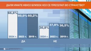 Две третини од граѓани веќе имаат некој близок кој се преселил во странство. Споредбата со анкетите од последните 5 години покажува дека бројот на граѓани кои имаат свои блиски кои се иселиле од Македонија скокнал од 60% лани на 66,6% оваа година.