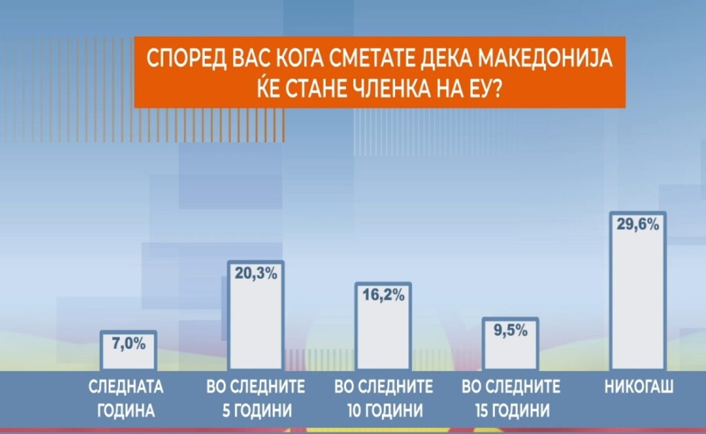 Сепак прогнозите на граѓаните за полноправно членство на државата во ЕУ не се оптимистични. Речиси секој трет или 29,6 проценти велат дека земјата никогаш нема да се приклучи на ЕУ. 20 проценти сепак сметаат дека тоа може да се случи во следните 5 години.