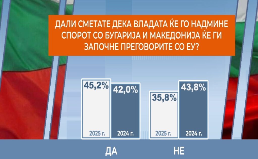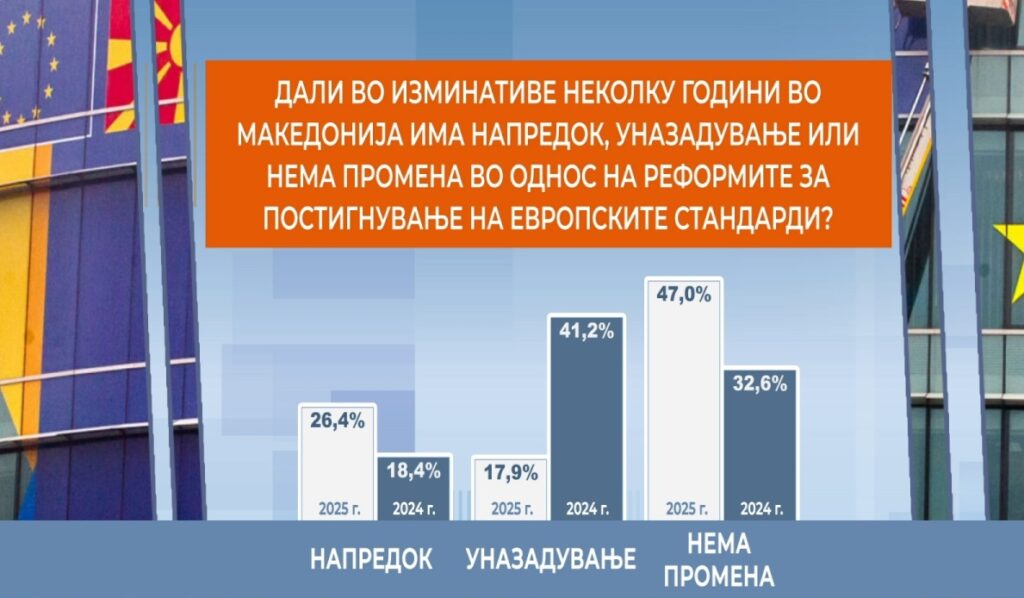 Дека во изминатите години има напредок во спроведувањето на реформи и достигнувањето на европските стандарди сметаат само 26 проценти од испитаниците. Сепак споредено со истата анкета спроведена лани, има значително намалување на бројот на испитаници кои велат дека назадуваме од 41 кои таков одговор дале во 2024та година на 17 проценти оваа година.