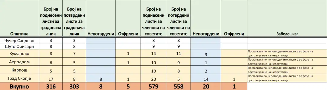 Од доставените листи, отфрлени се вкупно пет листи за градоначалник на општина и тоа по една листа за општините Бутел, Центар, Куманово, Аеродром и Град Скопје.