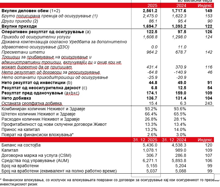 Во споредба со 2024 година, вкупниот деловен обем на групацијата органски порасна за 9% и достигна 1.868,3 милиони евра, а вклучувајќи го и новото работење од италијанскиот пазар достигна 2.561,2 милиони евра (раст од 49%). Комбинираниот количник за Неживот и Здравје изнесуваше поволни 93,2%.