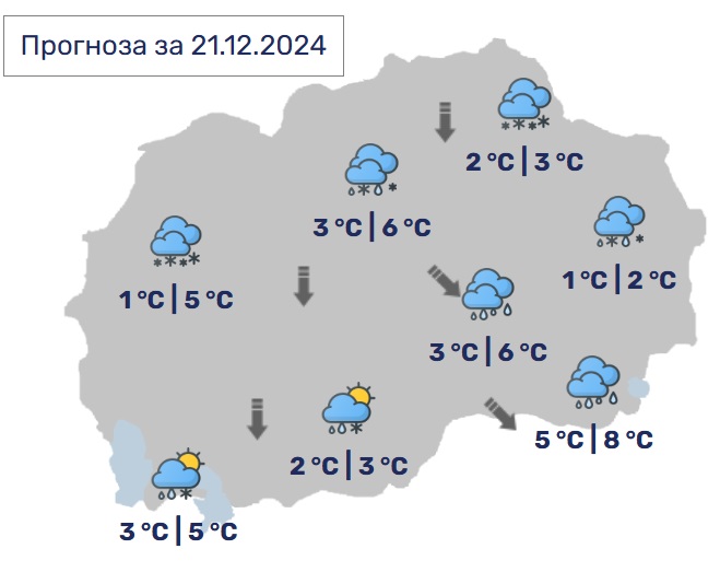 Во Скопје претежно облачно. Во утринските и претпладневните часови со повремени врнежи од дожд, а во повисоките делови од котлината врнежите од дожд ќе преминуваат во снег со слаб интензитет. Попладне врнежите ќе престанат. Ќе дува умерен до засилен северен ветер.
