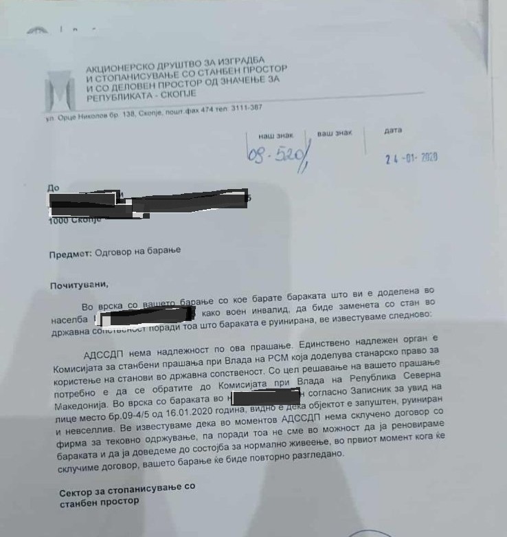 „Во 2003 година ни беше даден привремен монтажен објект – барака. По поплавата во 2008 година, таа барака стана руина, небезбедна и невселива. И самото Друштво за стопанисување со станбен и деловен простор (АДССДП) во своите одговори потврди дека објектот е во многу лоша состојба, руиниран, запуштен, со искршени врати и прозорци, обраснат со трева и без услови за живеење, а дека не носи одлуки за доделување станови, туку тоа е надлежност на владината Комисија за станбени прашања. Тоа значи дека АДССДП знае дека објектот не е за живеење, а Комисијата знае дека мора да одлучи – и сепак решение нема. И ова не го велам само јас, ова е службено потврдено“, вели И.С., сопругата на македонскиот бранител чиј идентитет по препорака на надлежните институции, МКД.мк сега нема да го открие, а за кого редакцијата поседува документи кои ја потврдуваат голготата на ова македонско семејство кое е оставено без кров над глава.