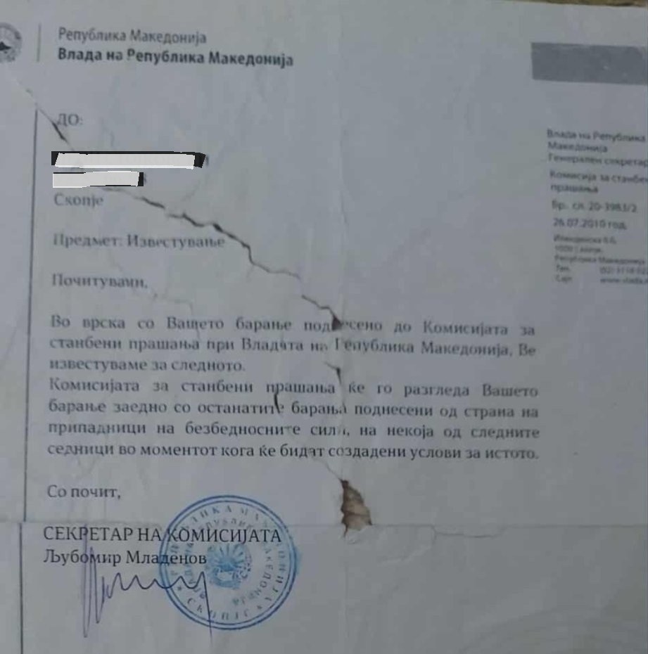 Но, ниту ова не помогнало за решавање на станбениот проблем на ова македноско семејство. Наместо конечна одлука, семејството добива уште едно известување дека постапката е во тек. Без правна поука. Без образложение. Без рок.