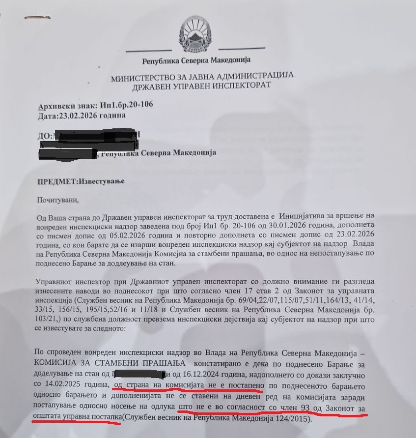 По извршениот вонреден надзор, на 23 февруари 2026 година, Државниот управен инспекторат (ДУИ) јасно и недвосмислено утврдил дека владината Комисија за домување воопшто не постапила по предметот и тој никогаш не бил ниту ставен на дневен ред на комисијата.