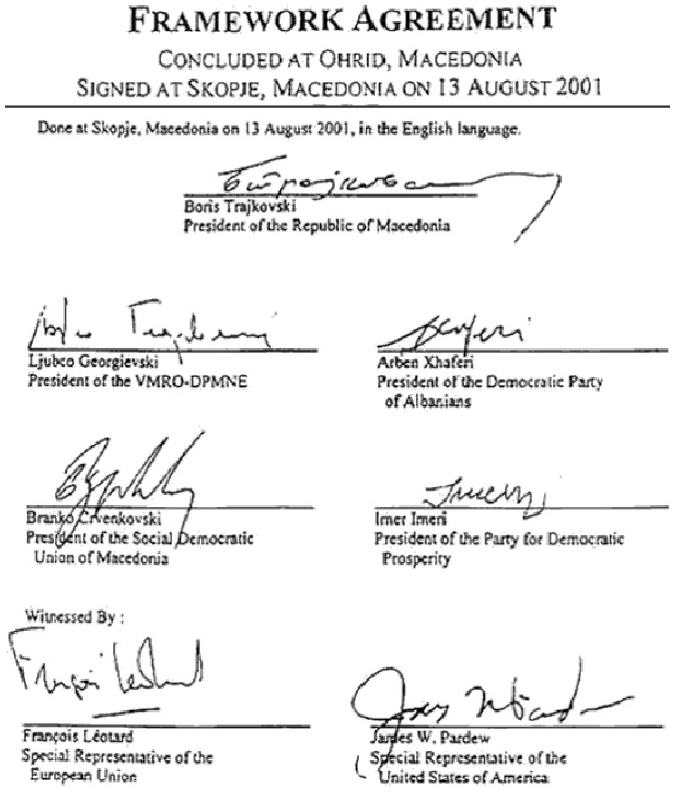 Охридскиот рамковен договор беше потпишан на 13 август 2001 година во претседателската резиденција на Водно во Скопје од страна на тогашниот претседател на државата Борис Трајковски, тогашниот премиер и лидер на ВМРО-ДПМНЕ, Љубчо Георгиевски, како и тогашните лидери на СДСМ, Бранко Црвенковски, на ПДП, Имер Имери, и на ДПА, Арбен Џафери. Свои потписи на договорот ставија и специјалните претставници на ЕУ и на САД, Франсоа Леотар и Џејмс Пердју.