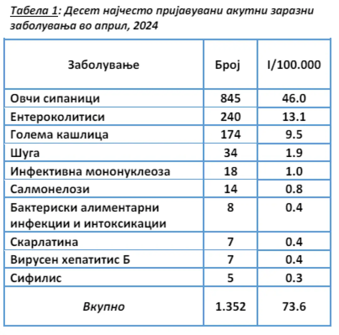 „Во текот на април, најчесто регистрирано акутно заразно заболување се овчите сипаници со вкупно 845 пријавени лица. Во однос на претходниот месец март, се регистрира зголемување на бројот на пријавени од овчи сипаници за 2,4 отсто, додека во однос на месец април 2023, се регистрира намалување за 12,6 проценти“, наведуваат од ИЈЗ.