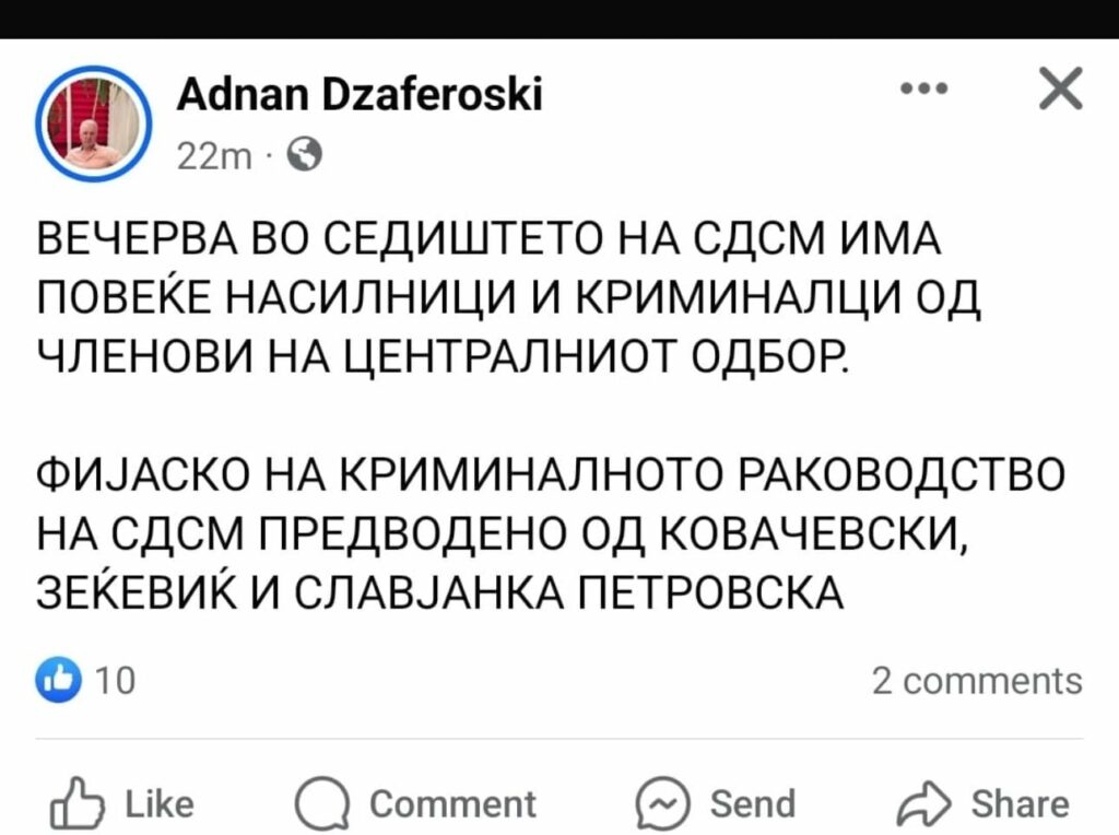 „Криминалното јадро на СДСМ пробува да остане до септември на чело на партијата…Просториите на СДСМ на Бихаќка запоседнати се од насилници ангажирани од Ковачевски и Зечевиќ…