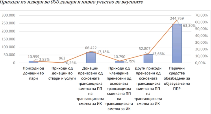„Најголемо учество во вкупните приходи има коалиција Твоја Македонија предводена од ВМРО ДПМНЕ (37%), по која следат коалиција за Европска иднина, предводена од СДСМ (25%), коалиција Европски фронтл предводена од ДУИ (15%), коалиција Вреди предводена од Алтернатива (13%), ПП Левица (4%), коалиција Храбро за Македонија предводена од ГРОМ (2%), додека учеството на останатите учесници е под 1% “, информира ДЗР.