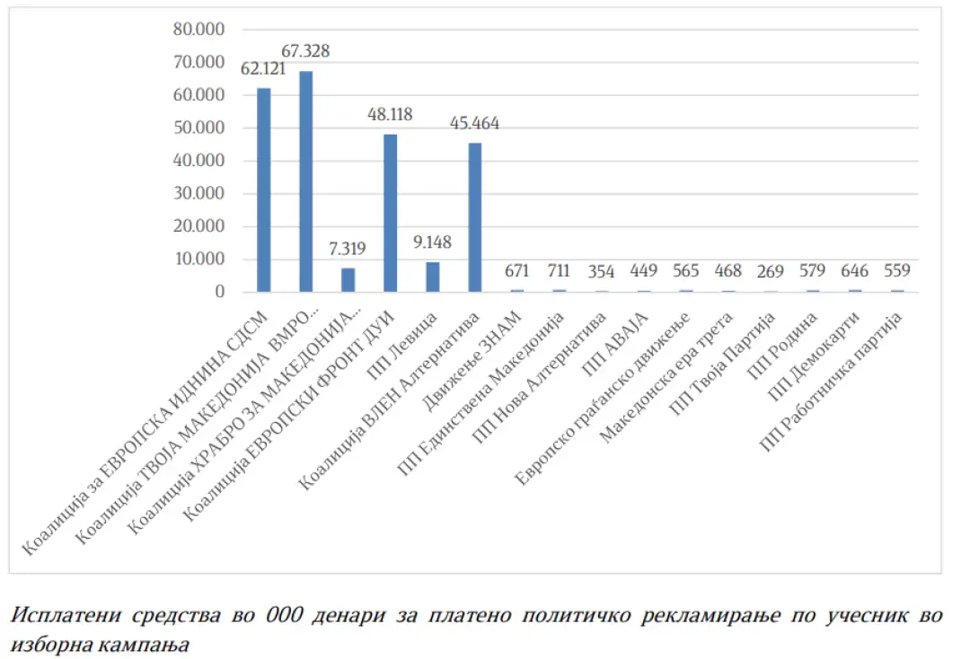 Во соопштението од ДЗР се наведува дека вкупните расходи направени од учесниците во изборната кампања за избор на пратеници се во износ од 386.710 илјади денари, од кои 140.261 илјада денари се плаќања од трансакциските сметки, 963 се расходи по основ на примени донации во непарични средства и 244.769 илјади денари се расходи за објавено ППР. Неискористените финансиски средства, од трансакциските сметки „за изборна кампања“ кои согласно финансиските извештаи се прикажани како расходи во вкупен износ од 717 илјади денари се вратени на сметките за редовно работење на политичките партии. Најголемо учество во вкупните расходи 63,3 проценти имаат расходите за платено политичко рекламирање, по што следат расходите исплатени од трансакциските сметки за набавка на стоки и услуги 36,3 проценти.