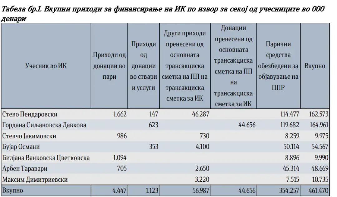 Ревизорите утврдиле дека вкупните приходи и расходи на сите седум учесници во изборната кампања за претседателските избори се во износ од 461.470 илјади денари, а 77 проценти од нив или 354.257 илјади денари, се обезбедени од буџетот на државата за платено политичко рекламирање и се исплатени преку Државната изборна комисија, директно на медиумите.