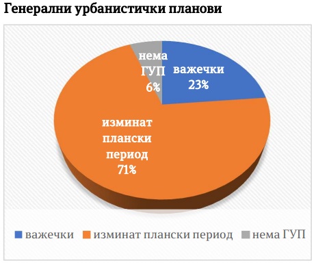 Постапката за донесување на урбанистички планови се врши преку електронски систем е-урбанизам, но поради комплексноста, обезбедувањето на мислења од 22-30 институции/установи и правни лица, должината на законски утврдените рокови и нивното недоследно почитување, од вкупно 34 општини со седиште во град, 8 општини (23%) имаат важечки ГУП, 24 општини (71%) имаат ГУП со изминат плански период, а две општини (6%) воопшто немаат донесено генерален урбанистички план. Генералните урбанистички планови на 14 општини се донесени по изминување на 3 до 5 години од планскиот период за кој се однесуваат, со што градовите не се во можност да ги разработат со детални планови за времетраење на периодот. Од 2020-2024 година, 77% од постапките за донесување на ДУП во системот е-урбанизам не се завршени поради непочитување на законски утврдениот рок за траење на постапката до 18 месеци која за одредени општини трае и до 4 години.