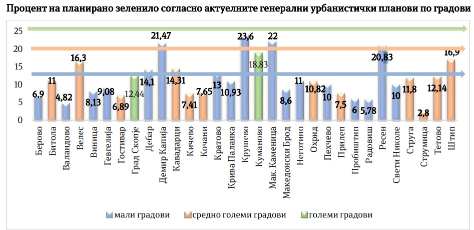 „Од 34 општини со седиште во град само две општини (Град Скопје и Општина Охрид) имаат донесено стратегии за развој на зеленилото. Зелен катастар во форма на ГИС1 портал имаат три општини (Град Скопје, Кавадарци и Охрид), а 18 општини не ја испочитувале обврската за донесување на годишни програми за подигање и одржување на зеленилото. Ова укажува на немање долгорочна визија, цели, активности и индикатори за следење на урбаното зеленило на локално ниво.