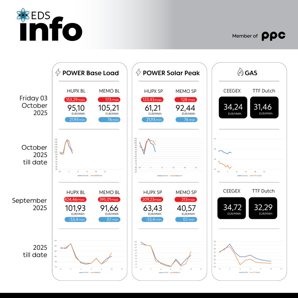 Цената на електричната енергија во текот на дневните часови (9 – 15 часот Power solar peak) на HUPX постигна ниво од 61,21 евра за мегават час, а на MEMO 92,44 евра.