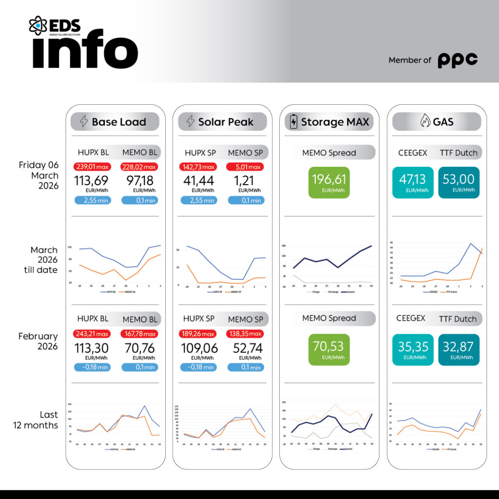 Цена на Storage MAX, индекс кој ја покажува разликата помеѓу часовните берзански цени помеѓу 12 и 14 часот наспроти часовните берзански цени во периодот помеѓу 18 и 20 часот, изнесува 196,61 евра за мегават час.