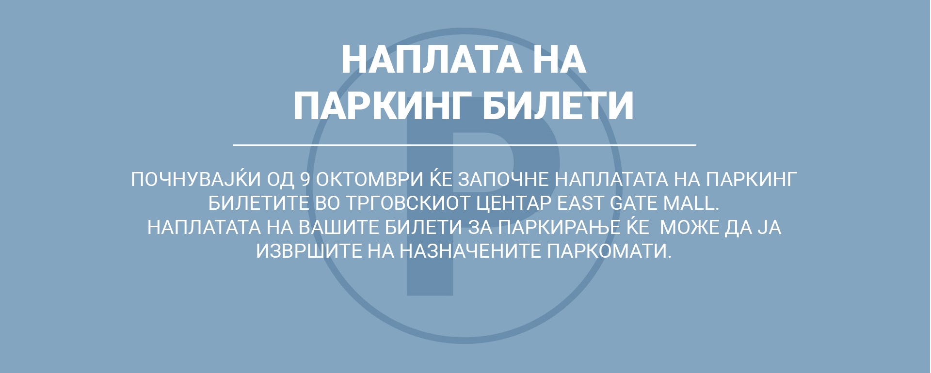 Во соопштението се наведува дека од понеделник, 9 октомври, трговскиот центар Ист гејт лол воведува систем за наплата на паркингот по речиси две години откако се отвори трговскиот центар. Првиот час е бесплатен, а потоа следните 2 часа чинат 30 денари. По изминатите 3 часа, паркингот ќе чини 20 денари секој започнат час. Иако се менува режимот на паркингот, цената е пониска од просечната цена на паркингот во главниот град, велат од трговскиот центар.