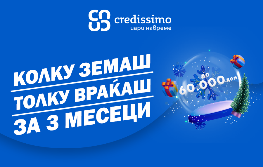 И оваа година, во пресрет на новогодишните и божиќните празници компанијата ќе ги израдува своите клиенти со нова промоција за бескаматен кредит дури до 60.000 денари со рок на исплата за 3 месеци. Едноставно, колку земаш – толку враќаш!