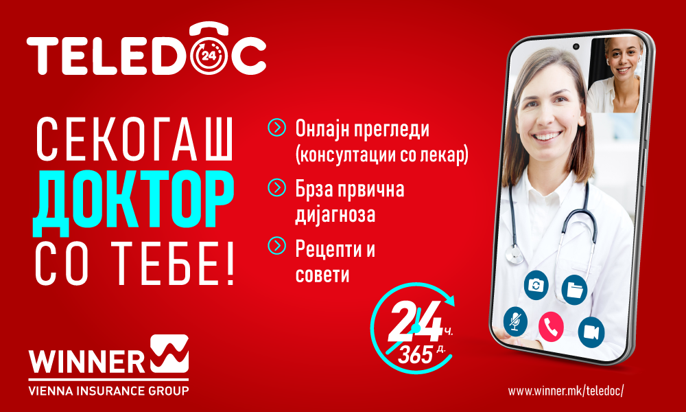 ТeleDoc платформата дава можност за неограничен број на видео консултации со лиценцирани општи лекари од Македонија, 24/7/365 без никаков исклучок, временско или територијално ограничување. Исто така доколку сте на пат или надвор од земјата ова е најбрзиот начин да добиете помош за каква било здравствена состојба, достапна веднаш преку мобилен телефон, лаптоп уред или пресонален компјутер. Согласно остварениот видео повик осигуреникот ќе добие брза првична дијагноза, терапија, или во најмала рака конкретна насока за понатамошно постапување, со цел спречување на дополнителен прогрес на здравствена состојба, односно што побрзо постапување по истата, токму преку првичната брза реакција во вид на видео консултација со доктор, како и валидeн, меѓународно признат „розов рецепт” за набавка на потребни лекарства.