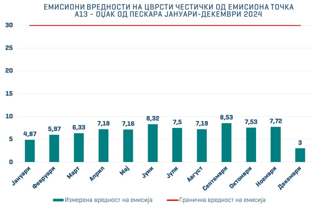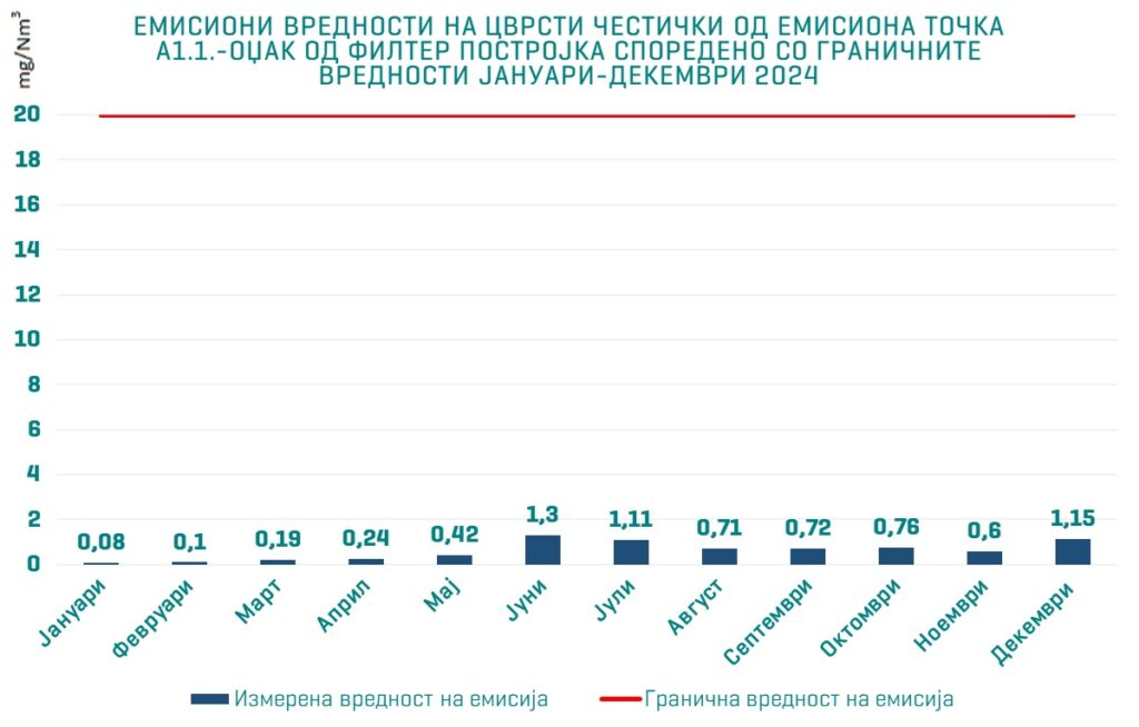Во овој период (октомври-декември 2024), според мерењата на двете мерни точки, емисиите на цврсти честички се од три до 30 пати пониски од оние што се пропишани како гранично дозволени од Министерството за животна средина, а дефинирани во А-интегрираната еколошка дозвола, како и од пропишаните европски гранични емисиони вредности.