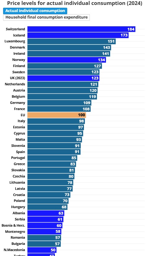 Според Евростат, со паритетот на куповната моќ може да се пресмета колку луѓето можат да купат со иста вредност на пари во различни земји. Резултатите се базираат на анкети за цени што опфаќаат повеќе од 2.000 потрошувачки стоки и услуги (храна, облека, пијалоци, хотели…), спроведени во 36 европски земји.