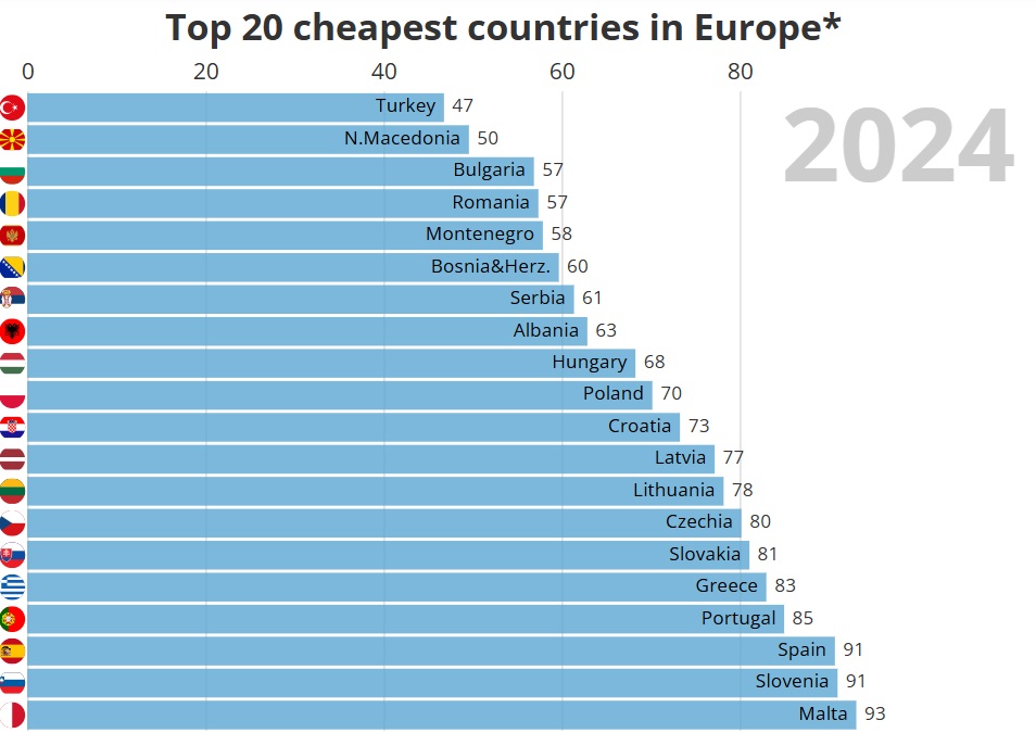 Турција е најевтина, со цени од 47% од просекот на ЕУ, што значи дека се 53% пониски од просекот на ЕУ.