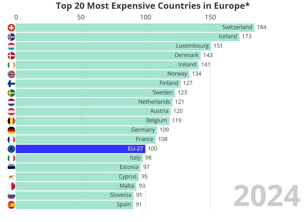 Сите пет нордиски земји – Данска, Финска, Шведска, Норвешка и Исланд исто така постојано се рангираат близу врвот. А земјите од Централна и Источна Европа генерално имаат пониски нивоа на цени. Романија, Бугарија, Унгарија, Полска и балтичките држави – Латвија, Литванија и Естонија – се под просекот на ЕУ. Овие региони обично бележат пониски трошоци за работна сила.