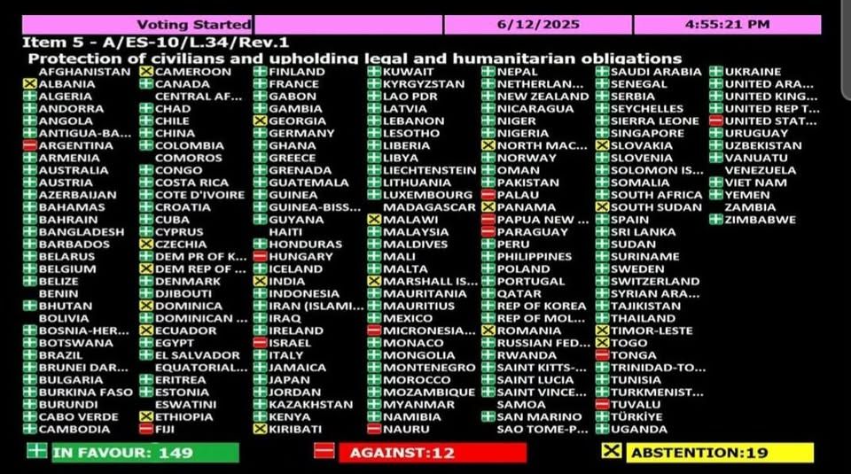 Резолуциите на Генералното собрание на ОН не се обврзувачки, но даваат слика за политичкиот распоред на силите и влијанијата низ светот.