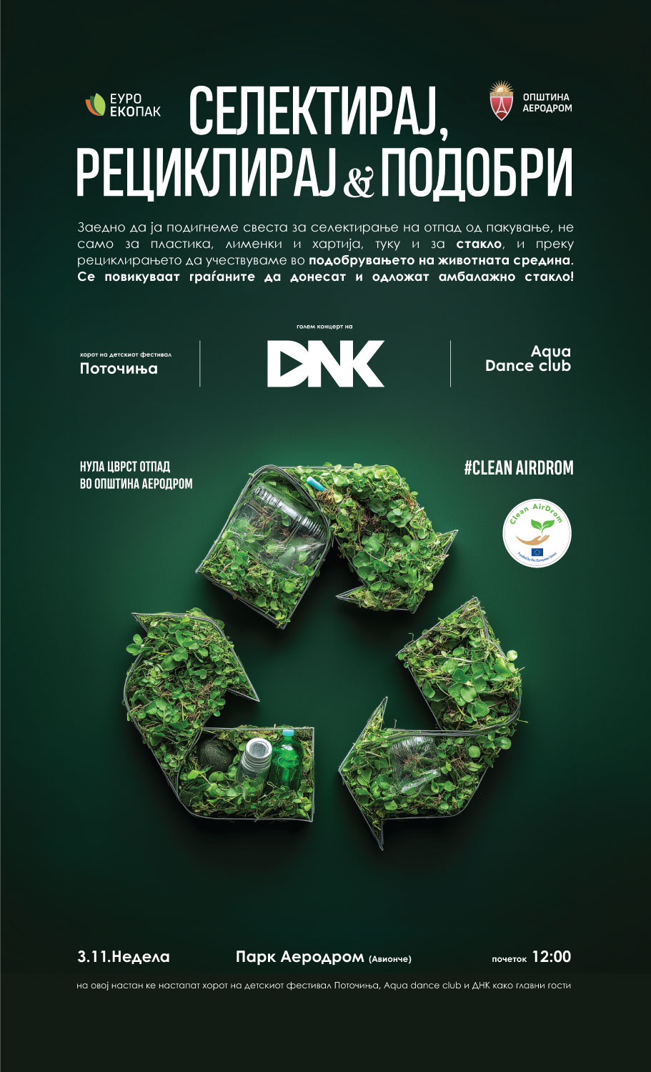 Проектот CleanAirDrom го реализира Општина Аеродром, а „Еуро-екопак“ се вклучува како поддржувач и во рамки на активностите, поставени се машини за собирање пластични шишиња во девет училишта и две градинки. Секое шише има своја вредност и како директна субвенција се доделува на училиштето односно градинката во даден временски период, а на основа на предодредена програма која општината ќе ја донесе за таа цел. Имајќи предвид дека во Општина Аеродром има 77.000 жители, над 2.500 деца во градинките и над 7.000 ученици во основните училишта, проценките дека на годишно ниво е дека можат да се овозможат и до 1,3 милиони денари за 11 училишта и градинки преку овој пилот проект. Колку повеќе се селектира, толку повеќе се донира за овие институции.