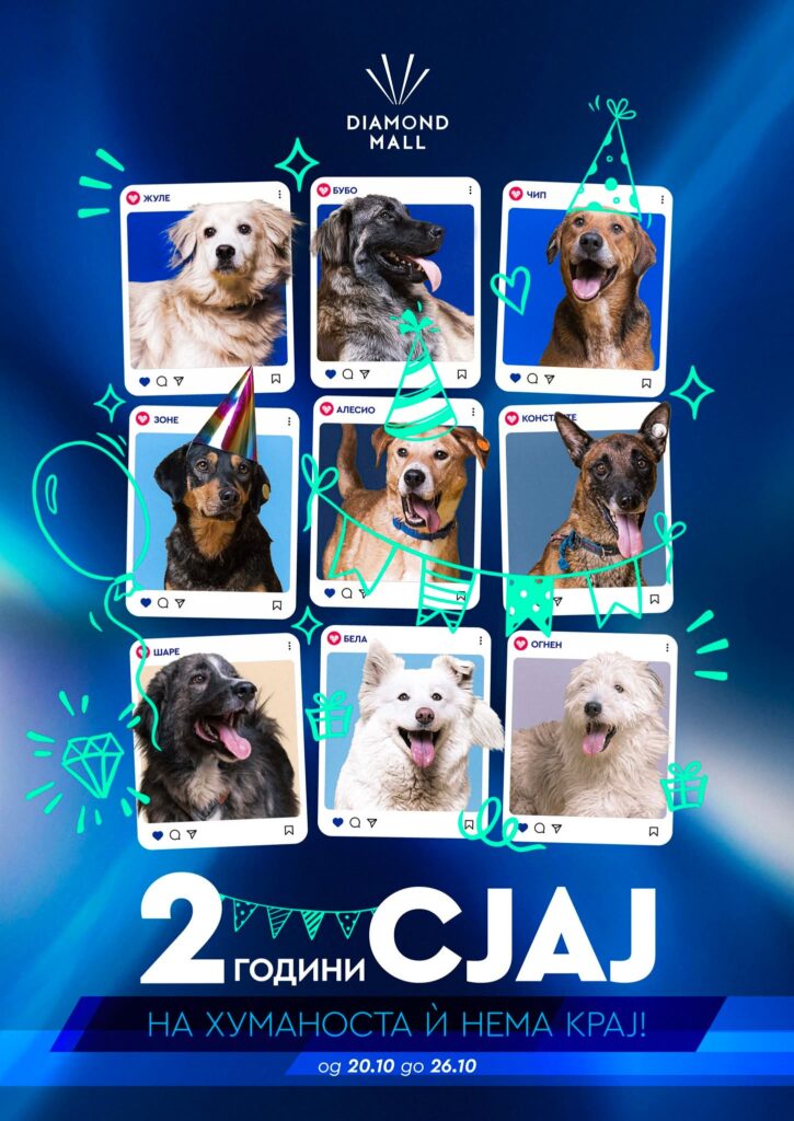 На 26 октомври ќе се случи големиот хуманитарен концерт во атриумот на Diamond Mall, а ќе настапат популарни пејачи Тамара Тодевска, Лозано, Викторија Лоба, кои се познати и по грижата за животните. Специјален гостин ќе биде музичката легенда Драган Мијалковски. Влезот ќе биде бесплатен, а единствен услов, во духот на целиот настан, ќе биде да се донесе минимум еден килограм храна за кучиња, која потоа ќе ѝ биде донирана на „Лајка“, која е партнер на Diamond Mall во реализација на овој хуманитарен настан. Во 14.00 часот ќе бидат објавени добитниците од роденденската наградна игра, по што концертот продолжува.