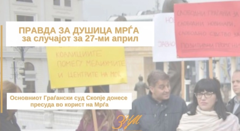 Во еден од случаите за слободата на медиумите и правата на новинарите, Основниот граѓански суд – Скопје донесе пресуда во корист на новинарката Душица Мрѓа, која беше нападната за време на своето извршување на работните обврски на 27-ми април 2017 година во Собранието во Скопје. Од ЗНМ оценија дека оваа пресуда испраќа јасна порака дека насилството врз новинарите не треба да се толерира и дека правдата мора да биде задоволена.