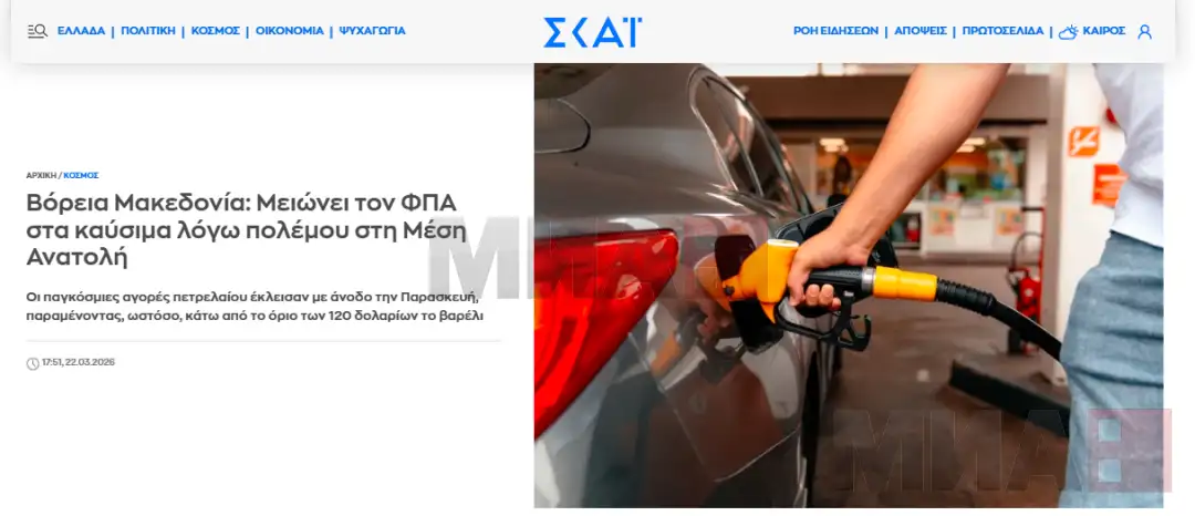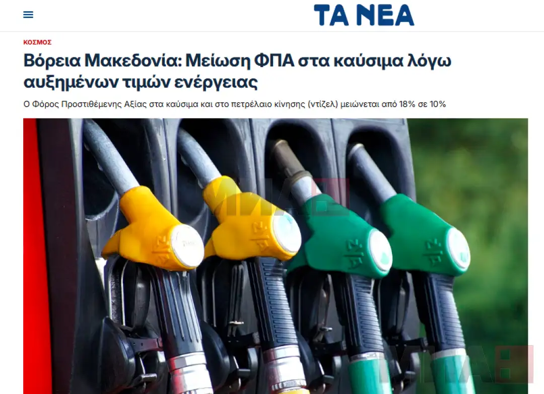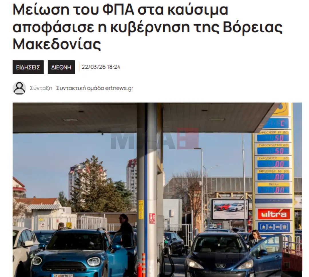 Медиумите во Грција коментираат дека „уште една земја воведува драстични мерки за запирање на поскапувањата поради војната на Блискиот Исток“, дека Maкедонија презема мерки за високите цени на горивата и објаснуваат дека ДДВ-то се намалува на 10 од 18 отсто што ќе важи за бензинот и дизелот за следните две седмици.