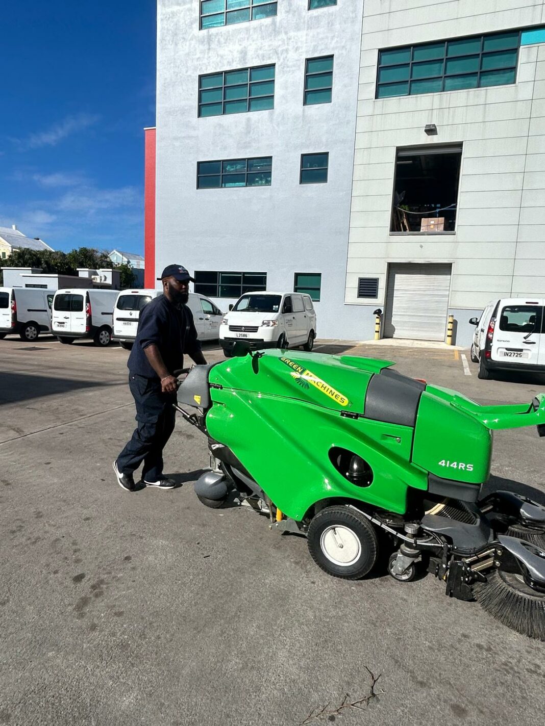 Клиентот од Бермудите го избра моделот 414 rs на Грин Машинс, со кој истовремено можат да се чистат и улици и тротоари, може да се управува рачно, но нуди можност и за седење на операторот.