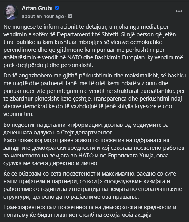 „Како човек кој мојот јавен живот го посветив на заштита на западните демократски вредности и кој секогаш работев напорно за членството на земјата во НАТО и во Европската Унија, оваа одлука ме засега директно и лично. Ќе се ангажирам со сета своја посветеност и максимално, заедно со нашите пријатели и партнери, со кои ја споделувавме визијата и работевме низ годините за интеграција на земјата во евроатлантските структури, целосно да го обелодениме ова прашање. Транспарентноста и посветеноста на демократските вредности и понатаму ќе бидат главен столб на секоја моја акција“, напиша Груби на фејсбук.