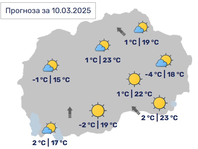 Утре времето ќе биде сончево и топло со мала до умерена облачност. Попладне и во текот на ноќта ќе има локален пороен дожд и услови за појава на грмежи. Ќе дува умерен, наместа повремено засилен ветер од југоисточен правец (над 60 km/h). Минималната температура ќе се движи од -2 до 4, а максималната од 16 до 21 Целзиусов степен.