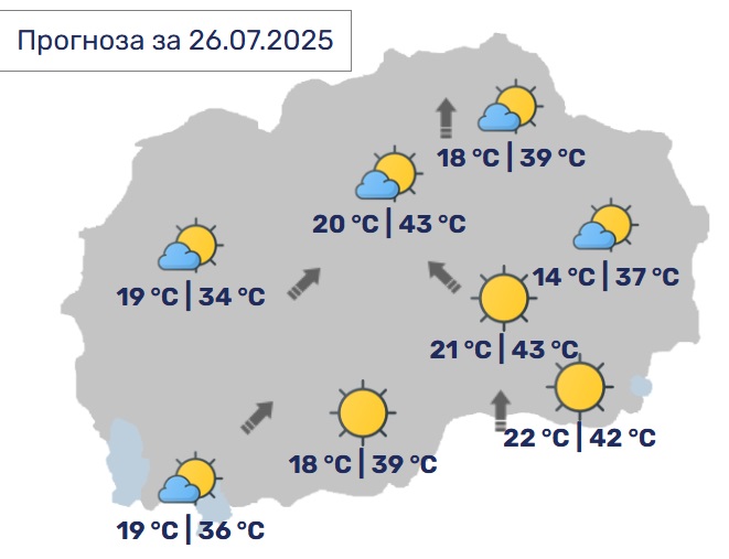 Утре времето ќе биде сончево и топло со мала до умерена локална облачност. Попладне ќе има изолирана појава на нестабилност со пороен дожд и грмежи. Ќе дува умерен, повремено засилен ветер од јужен, а кон крајот на денот и во текот на ноќта од северен правец.