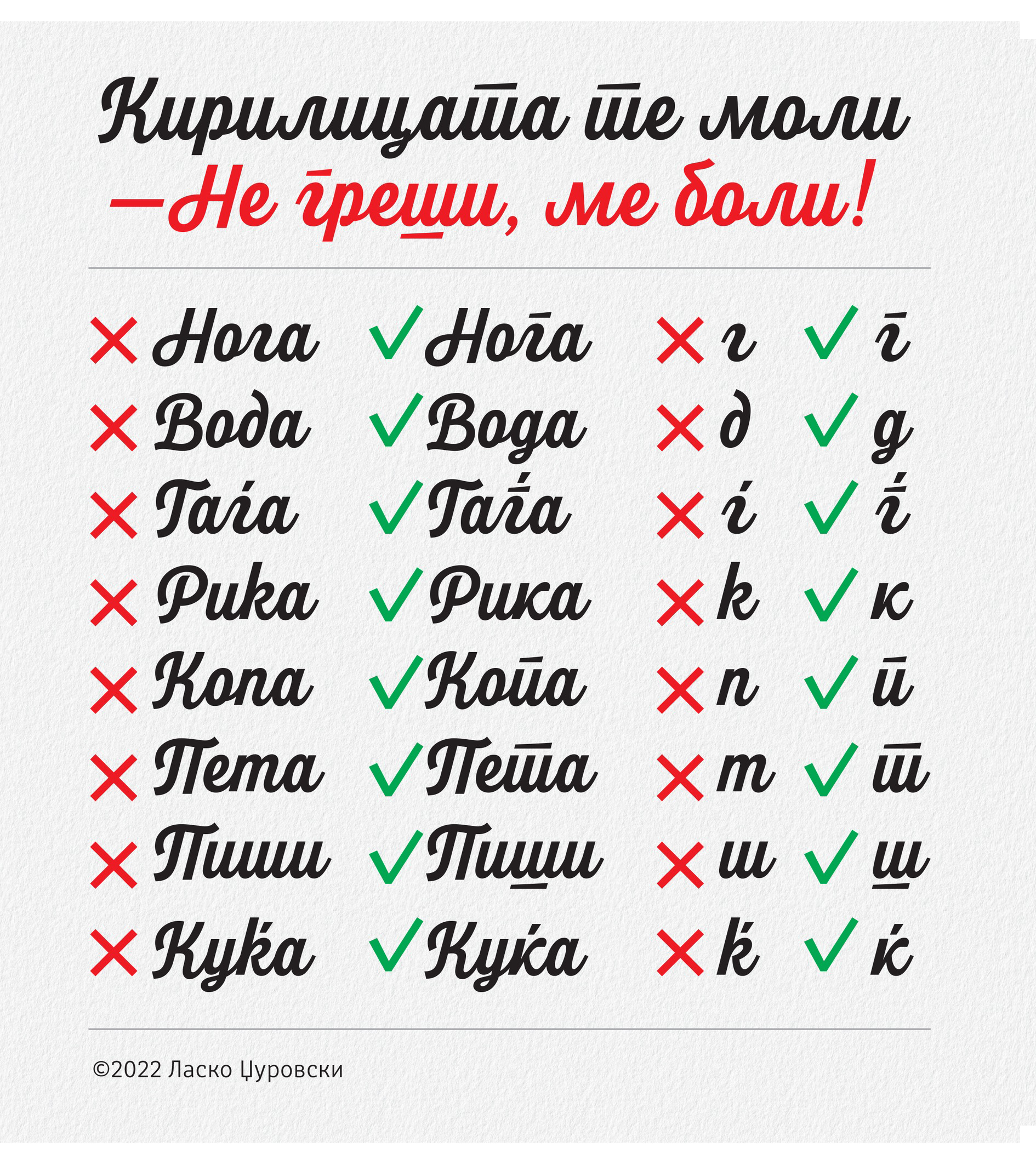 Недоследностите во употребата на македонската кирилица се присутни насекаде околу нас, во сите медиуми, дури и во учебниците, што несомнено е поразителен факт што сам по себе зборува за односот на државата кон кирилицата, која заедно со јазикот е еден од основните темели на нашиот идентитет.