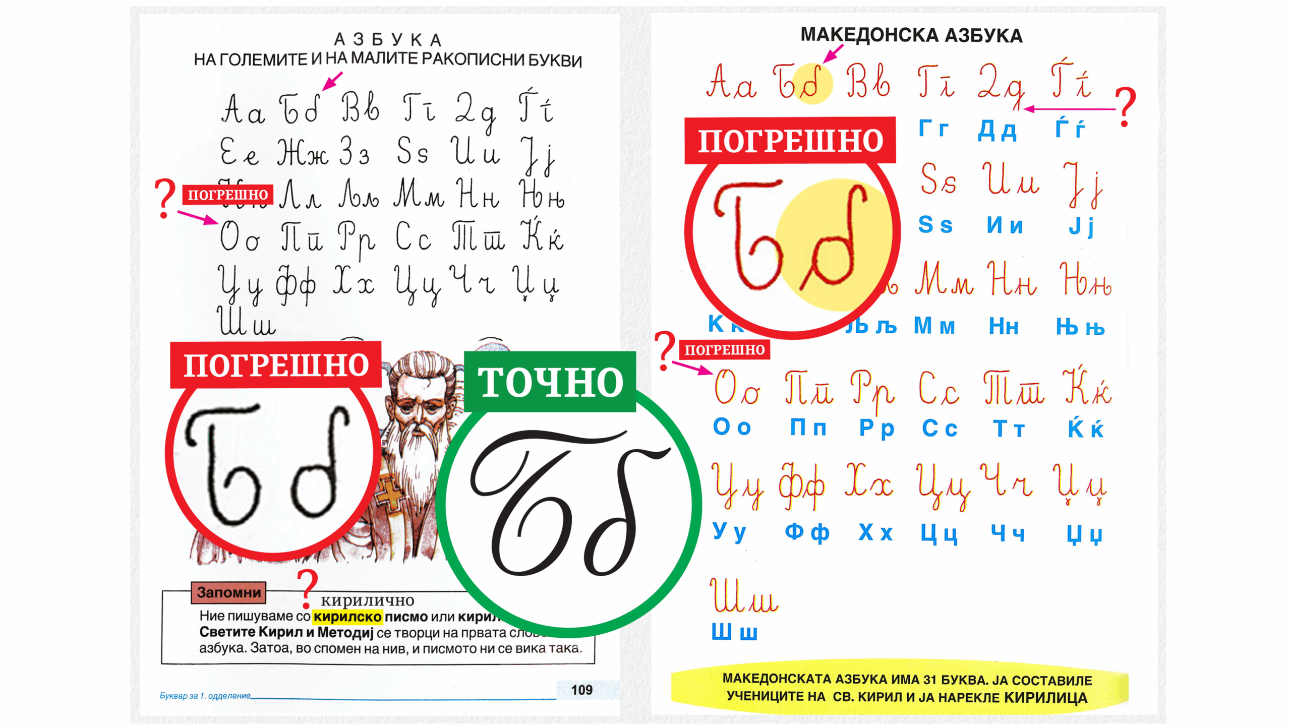 Да започнеме од основата, од учебниците – македонската кирилица не е точно прикажана во учебниците за основно образование. Нашите деца од почетокот учат со грешки, азбуките што се претставени во учебниците содржат неправилно напишани букви, особено ракописните. Не му се обраќа доволно внимание на тоа како се напишани лекциите во учебниците, со каков фонт, стиловите на употребените фонтови се измешани, што како последица создава забуна кај учениците кој е вистинскиот изглед на нашите кирилични букви.